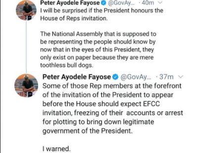 Reacting via his tweets, Fayose said the lawmakers demanding the citation should expect EFCC invitation, freezing of their accounts or arrest.