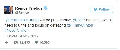 Reince Priebus, the chairman of the Republican National Committee, posted a tweet asking all Republicans to unite behind Trump so that they could defeat Hilary Clinton in the Presidential elections come November.