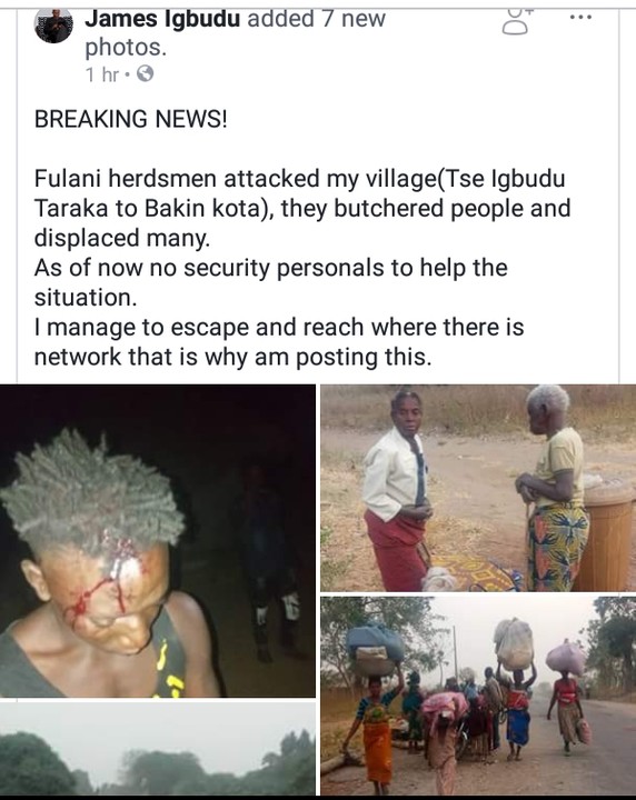 Fulani herdsmen attacked my village(Tse Igbudu Taraka to Bakin kota), they butchered people and displaced many.