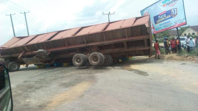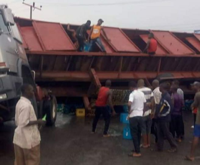 A truck carrying loaded crates of beer crashed and blocked the road before Abak bridge in Akwa Ibom. The incident was said to have happened on Thursday, March 28th.