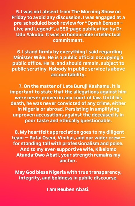 6. I wtand firmly by everything I said regarding Minister Wike. He is a public official occupying a public office. He is, and should remain, subject to public scrutiny. Nobody in public service is above accountability.