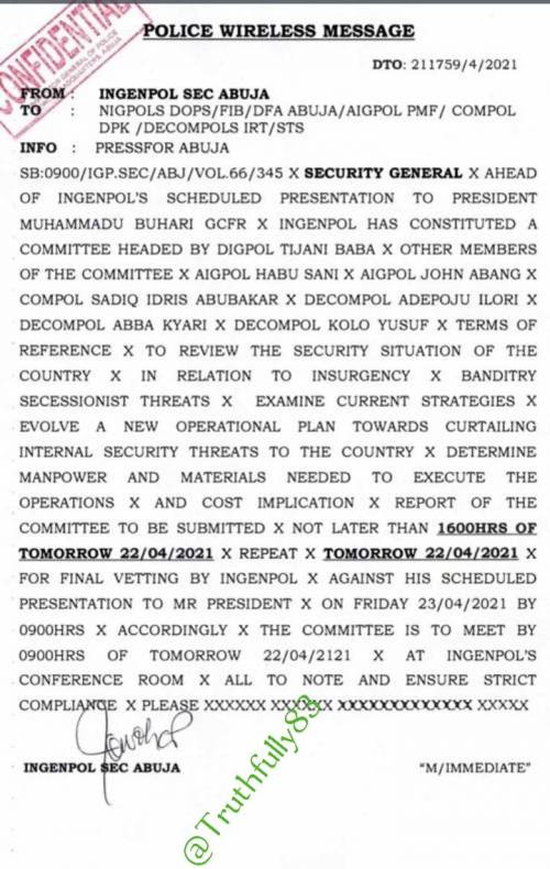 “The terms of reference are to review the security situation of the country and in relation to insurgency and banditry and secessionist threats and examine current strategies and evolve a new operational plan towards curtailing the internal security threats to the country and determine the manpower and materials needed to execute the operations and cost implication report of the committee to be submitted not later than 1600hours of 22/04/2021 for final vetting by the IGP against his scheduled presentation to Mr President on Friday, April 23 by 0900 hours.”