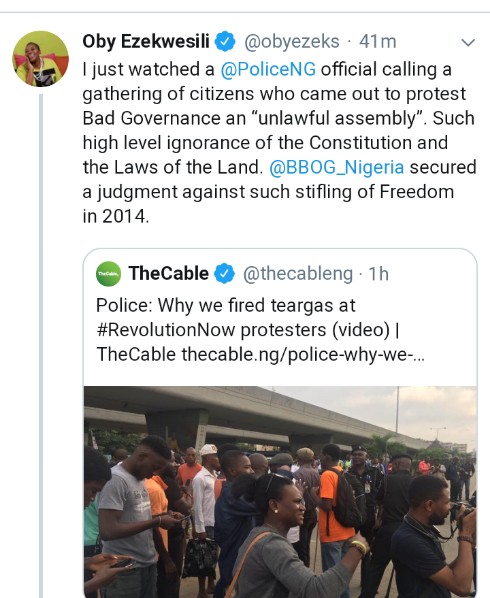 “I just watched a @PoliceNG official calling a gathering of citizens who came out to protest Bad Governance an “unlawful assembly”. Such high level ignorance of the Constitution and the Laws of the Land. @BBOG_Nigeria secured a judgment against such stifling of Freedom in 2014,” she said.