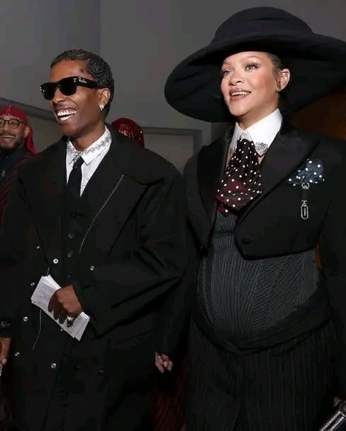 The couple makes a grand entrance at the event in an all-black ensemble, holding hands, with Rihanna tenderly cradling her baby bump.