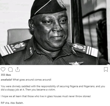 Activist, Charly boy has reacted to the assassination of former Chief of Defence Staff, Air Chief Marshal, Alex Badeh (retd.) who was attacked and shot dead by gunmen on the Abuja-Lafia Road.