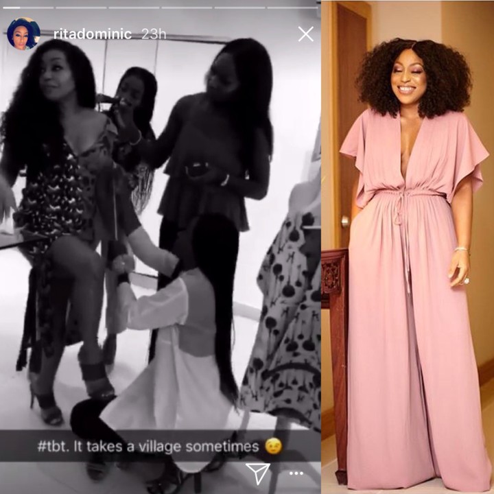 Nigerian actress, Rita Dominic shared a shot of her getting prepped up just before she hit the red carpet, with over 4ladies on the movie star, powdering and style and fitting the movie star into her gown.