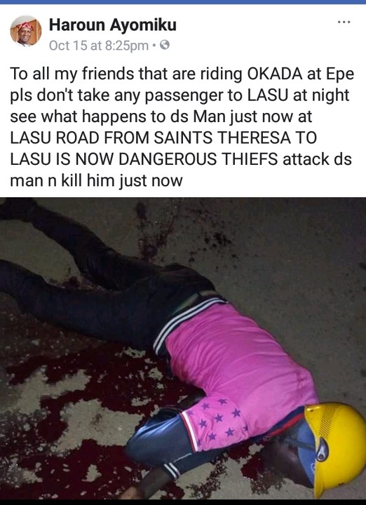 ‘To all my friends that are riding OKADA at Epe pls don’t take any passenger to LASU at night see what happens to ds Man just now at LASU ROAD FROM SAINTS THERESA TO LASU IS NOW DANGEROUS THIEFS attack ds man n kill him just now’