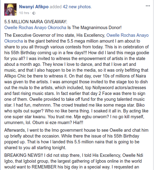 In celebration of his 55th Birthday, the Governor of Imo state owelle Rochas Anayo Okorocha has splashed 5.5 million naira to a facebook group which will be dispersed through various contestThis has come on the heels of intense suffering for the state workers and pensioners who are been owed backlogs of salaries and areas