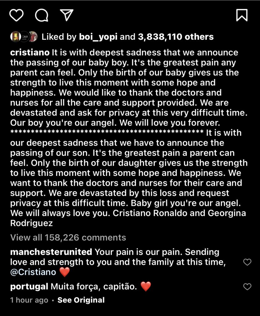 Manchester United star Cristiano Ronaldo has announced the death of his baby son in a heartfelt and statement uploaded to Instagram.