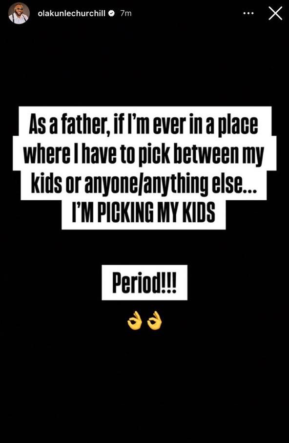 While neither party has released an official statement regarding the cause of the split, Churchill shared a cryptic post this afternoon, stating that if he is ever in a situation where he has to choose between anyone else or his kids, he will be choosing his kids.