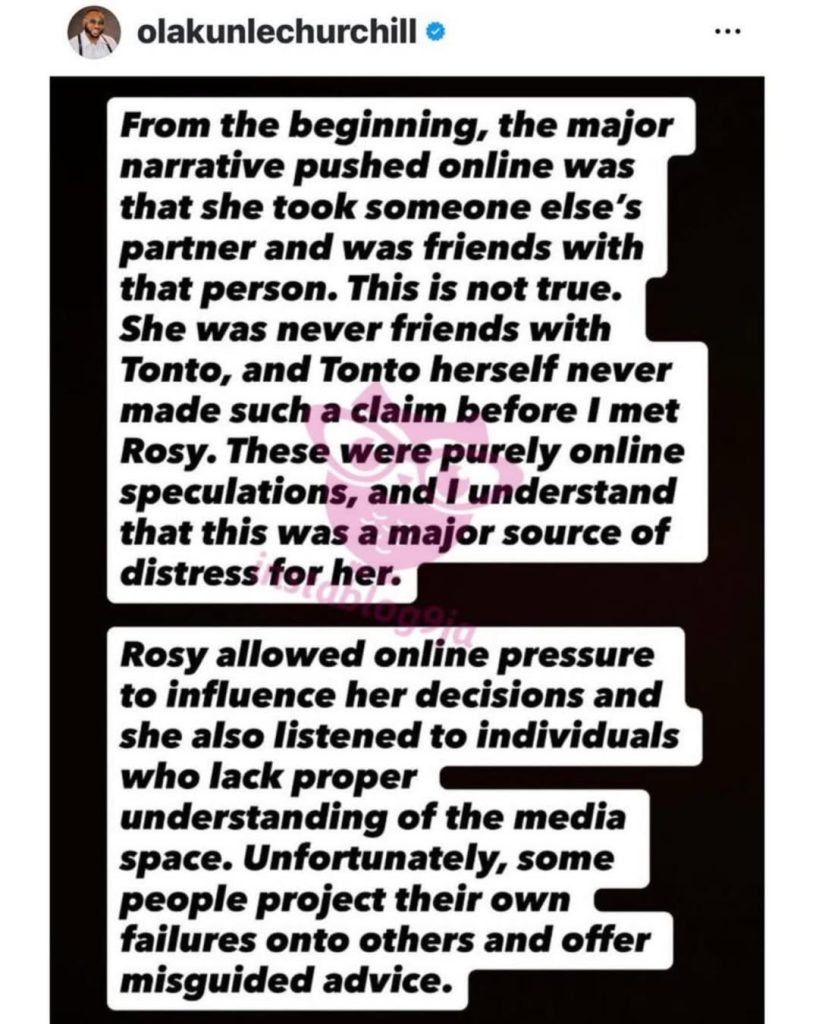 In a statement shared via social media this evening, Olakunle Churchill clarified that Rosy Meurer, was never friends with his ex-wife, Tonto Dikeh. He noted that Dikeh had never made such claims prior to his relationship with Meurer.