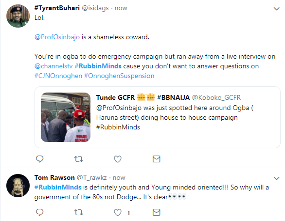 The cancellation announcement was made by Laolu Akande, a spokesperson for Mr Osinbajo, who in his tweet on Sunday afternoon disclosed that his boss will not be appearing on Channels Television‘s ‘Rubbin’ Minds’ because of campaign exigencies.