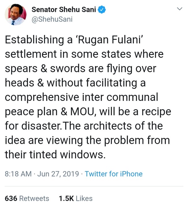 Shehu Sani, former Kaduna Central Senator, has faulted the Federal Government’s proposed establishment of Ruga settlements for herdsmen in some states of the federation.He said establishing the settlement without ensuring ensuring a comprehensive inter-communal peace will lead to disaster.Buhari government had disclosed that it was working towards establishing Ruga settlements for herdsmen in 12 pilot states nationwide.Mohammadu Umar, the Permanent Secretary in the Federal Ministry of Agriculture and Rural Development, made this known in Abuja on Tuesday.He said that the farm settlements, when fully established, would address incessant clashes between Fulani cattle rearers and farmers.Reacting, Sani tweeted: “Establishing a ‘Rugan Fulani’ settlement in some states where spears and swords are flying over heads and without facilitating a comprehensive inter communal peace plan and MOU, will be a recipe for disaster.The architects of the idea are viewing the problem from their tinted windows