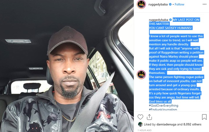 @ruggedybaba #Ruggedman pls come clean on snitching out @nairamarley on an assumed name to the @officialefcc. We Investigative Journalists also have “snitches” we call sources inside the antigraft agency. We need transparency in this investigation as the petitioner must stand trial too.