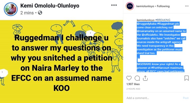 Ruggedman has reacted just after Kemi Olunloyo who waded into the Naira Marley controversy accused him of snitching. The journalist had accused the veteran singer of assuming a name to carry out the act. Kemi Olunloyo who asked Ruggedman to come clean, wrote;