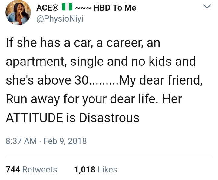 Nigerian physiotherapist identified as @physioNiyi on twitter has taken to the platform to warn all Nigerian men to stay away from any successful lady that is 30 years of age and still single with no kid.