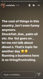 Popular Nigerian commediene and actress, Wofai Fada has lamented about the high cost of running a business in the country.