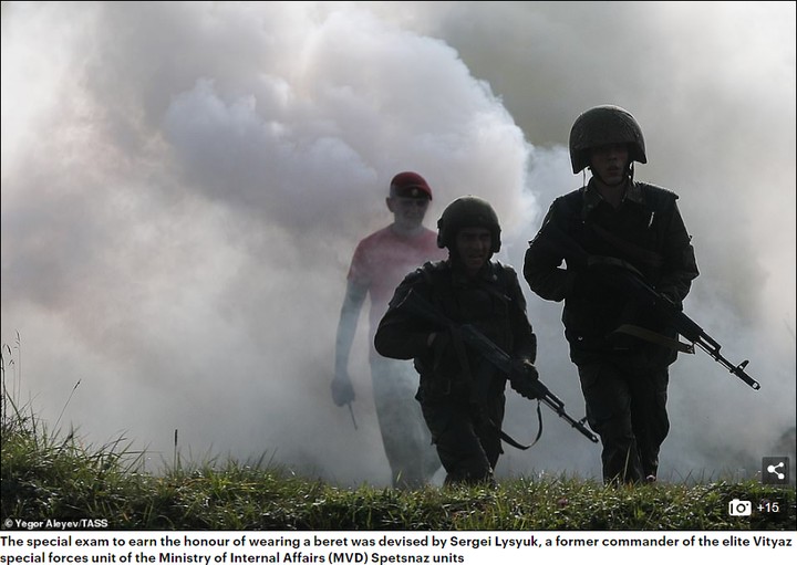 The special annual exam to earn the honour of wearing the beret was devised by Sergei Lysyuk, a former commander of the elite Vityaz special forces unit of the MVD.