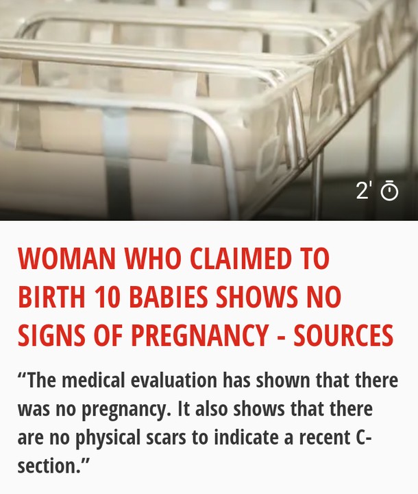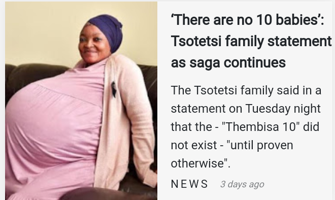 South Africa’s “Eyewitness News” on Friday learnt that the woman who claimed to have birthed decuplets (10 newborn babies) has shown no signs of ever being pregnant or delivering a baby in the past two weeks.