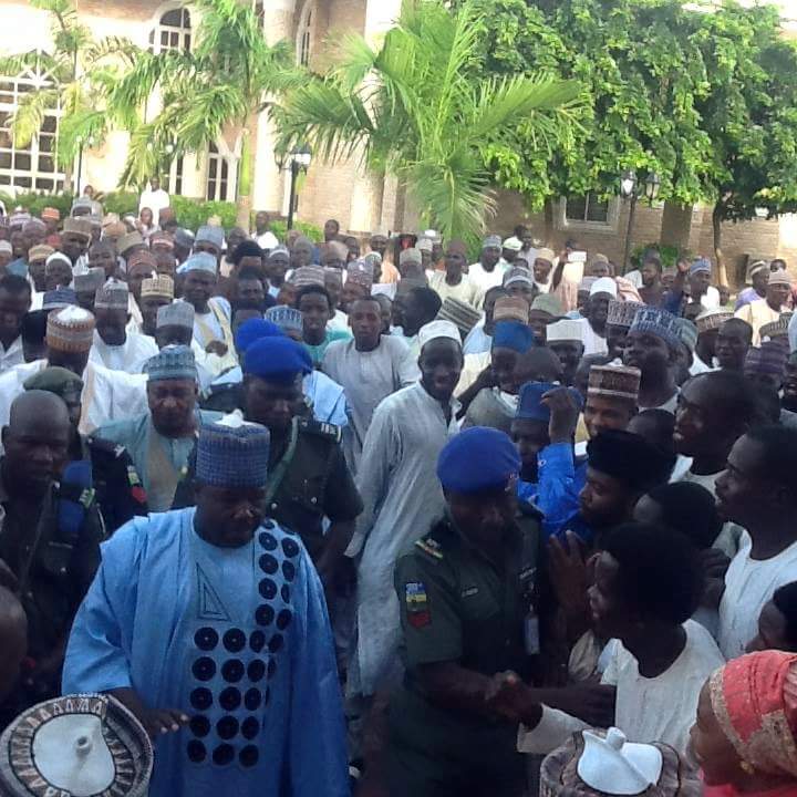 Former Peoples Democratic Party, PDP, National Chairman, Ali Modu Sheriff, ensured he brought joy to the people of Borno state as he hosted a large crowd who troops at his mansion in Maiduguri to celebrate with him during the Sallah holiday. The sacked chairman gave out cash and other gift items to the people as they prayed for him in appreciation.