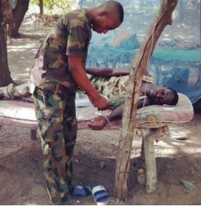 The sad situation Nigerian soldiers are passing through has been depicted in a viral photo of a soldier getting treating while his IV fluid hangs from a tree.