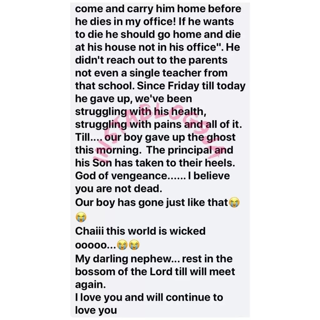 He was not sick, but died to the wickedness if humanity. On Friday last week, his classmates without any squabbles, ganged up and beat him.”
