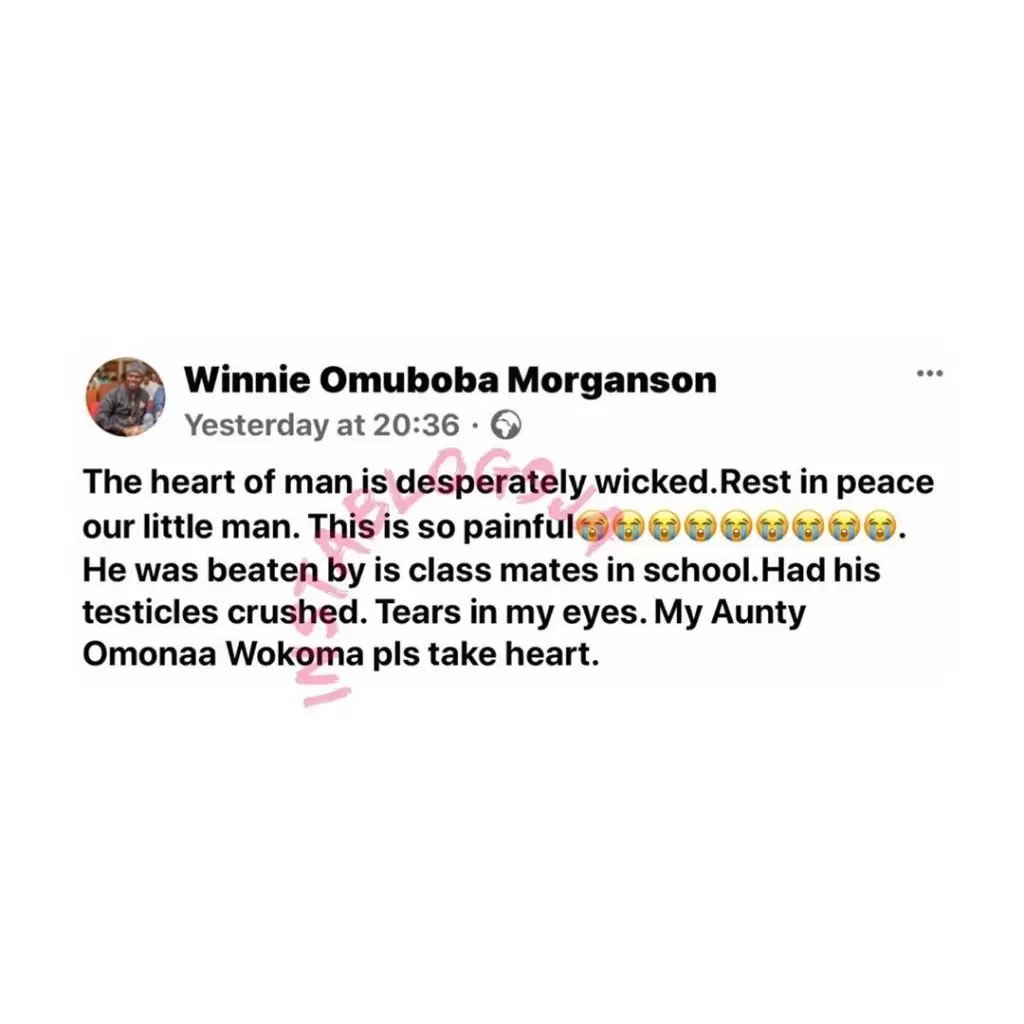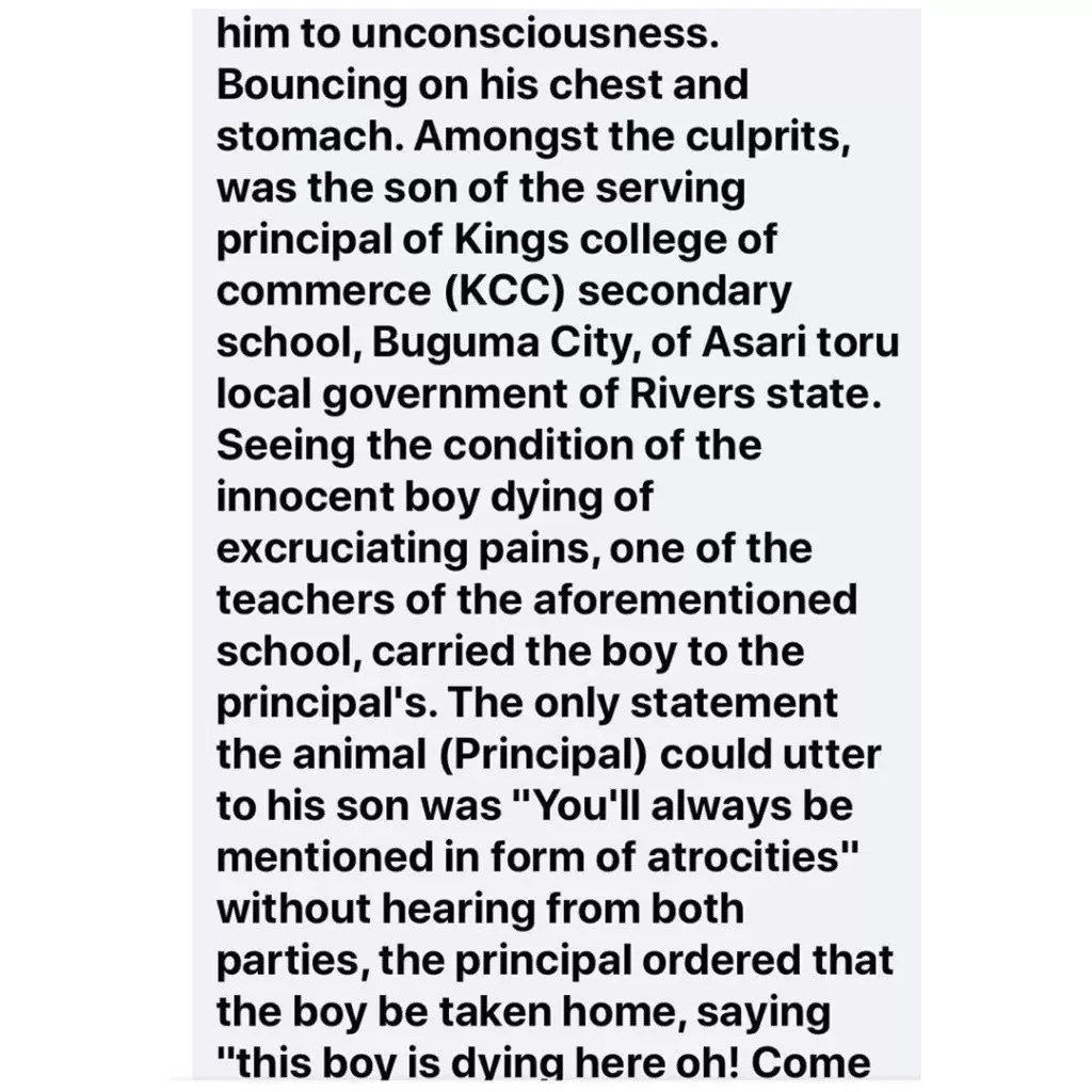 A secondary school student in Rivers State has reportedly been beaten to death by his classmates right inside the school premises. Information revealed by a Facebook user, Misspdd Wokoma, who is also related to the victim alleged that the Principal of Kings College of Commerce, and his son have a hand in the ugly incident which led to the death of the young student.