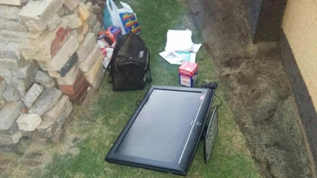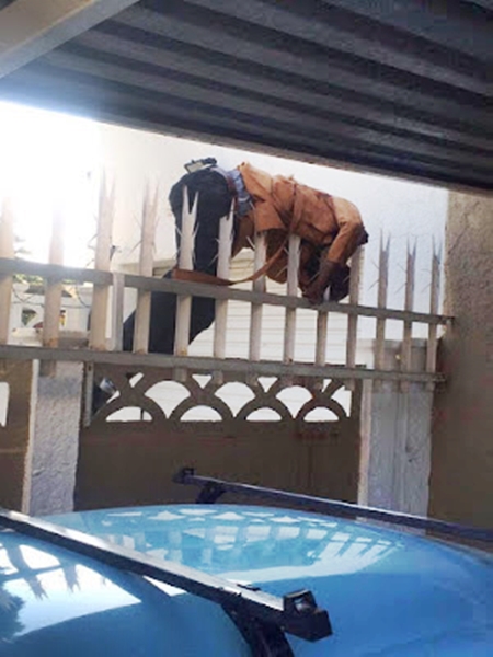 According to some shocking photos which emerged online some hours ago, a suspected robber who was trying to get away after burglarizing a house in the Robertsham area of South Africa on Saturday night, accidentally impaled himself on the sharp railings of the fence and ended his life there.