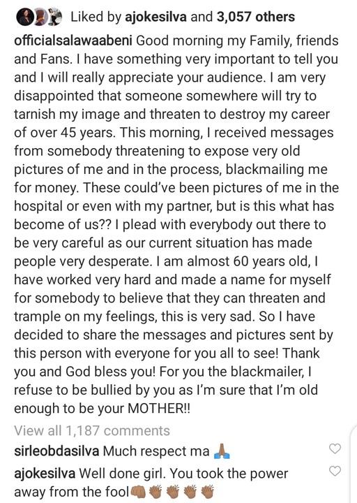 “Good morning my Family, friends and Fans. I have something very important to tell you and I will really appreciate your audience. I am very disappointed that someone somewhere will try to tarnish my image and threaten to destroy my career of over 45 years.