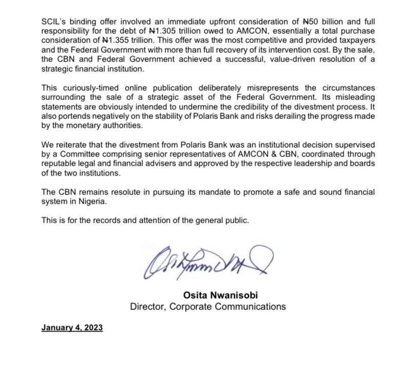 For the records, the public is referred to the statement dated October 20, 2022 by CBN & AMCON announcing the sale of 100% equity in Polaris Bank to a new core investor, Strategic Capital Investment Limited (SCIL), wherein it provided copious details of the process by which the sale was conducted.