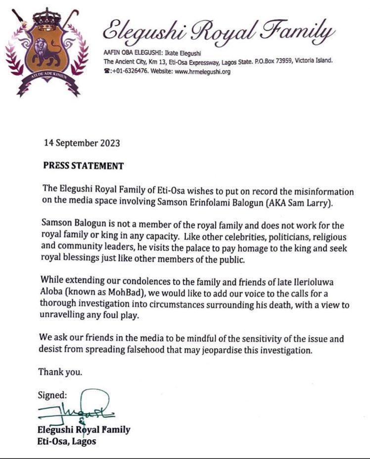 The Elegushi Royal family has released a statement distancing itself from Naira Marley’s associate, SamLarry. Recall that in June 2023, singer Mohbad had filed a petition before the Nigerian Police alleging Sam Larry who also goes by the name SamLarry Elegushi assaulted him during a music video shoot and went on to boast that nothing will happen as he works for the King. In a statement released this evening, the Elegushi family says SamLarry does not work for the king or the monarch in any capacity and is also not a member of the royal family.