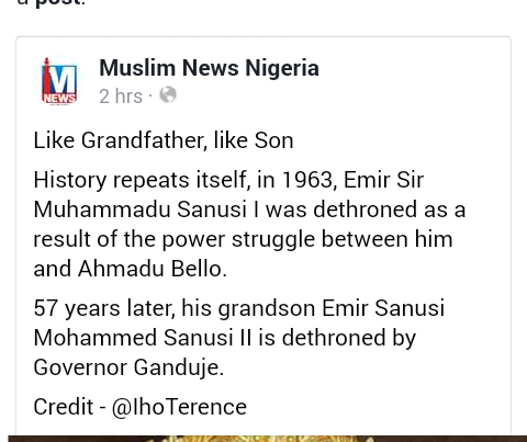 Just As His Grandfather, Muhammadu Sanusi 1, Was Dethroned As A Result Of Power Struggle (hidden Under The Cloak Of A Probe) Between Him And Ahmadu Bello. The Current Emir Of Kano Is Also Under Political Persecution.