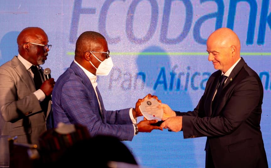 PIX 2 L-R: Lagos State Governor, Mr. Babajide Sanwo-Olu receiving NFF award of recognition being presented by FIFA President, Mr. Giovanni Infantino during the NFF dinner reception in honour of the FIFA President at the Eko Hotels and Suites, Victoria Island, Lagos, on Wednesday, September 15, 2021.