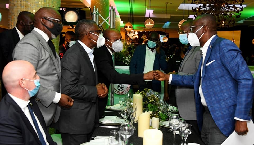 PIX 5 L-R: Minister of Youth and Sports Development, Mr. Sunday Dare, Ex-Nigeria International, Daniel Amokachi and Lagos State Governor, Mr. Babajide Sanwo-Olu during the Nigeria Football Federation (NFF) dinner reception in honour of the FIFA President at the Eko Hotels and Suites, Victoria Island, Lagos, on Wednesday, September 15, 2021.