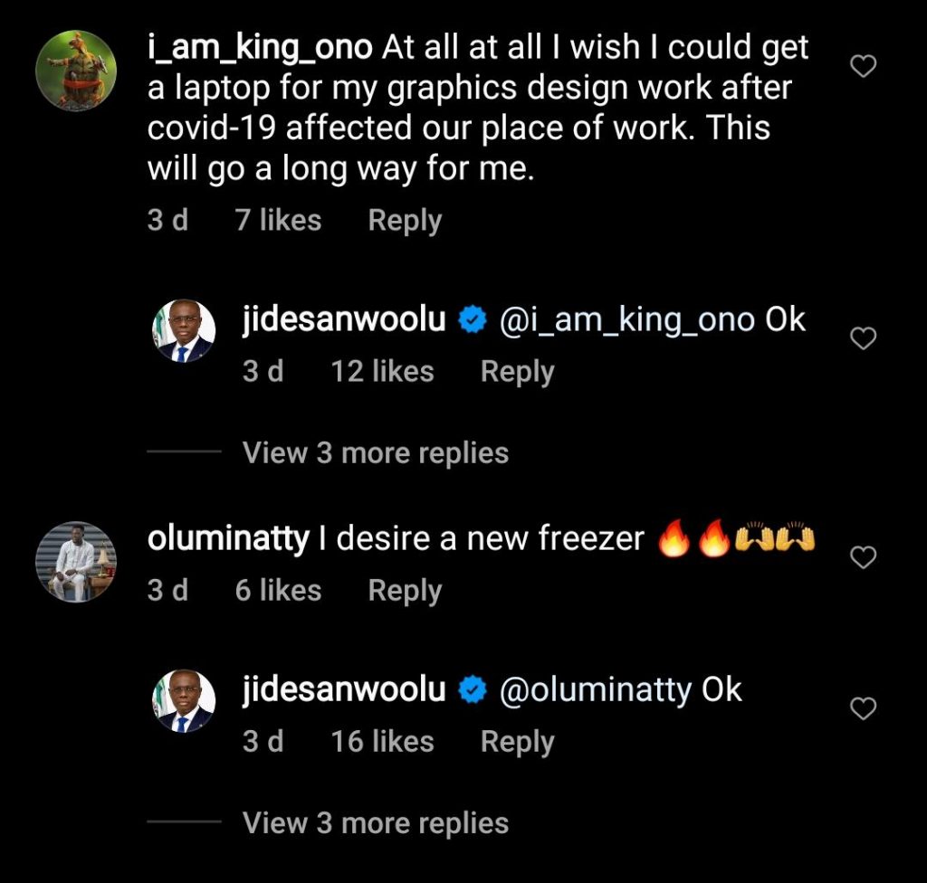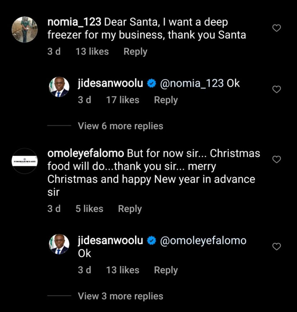 Like Santa Claus, Governor Sanwo-Olu had on Instagram given out gifts in response to his post on charity for the festive season.