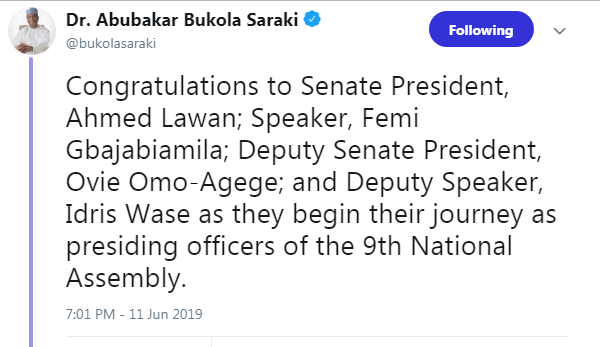 Former Senate President, Oloye Bukola Saraki Congratulations to Senate President, Ahmed Lawan; Speaker, Femi Gbajabiamila; Deputy Senate President, Ovie Omo-Agege; and Deputy Speaker, Idris Wase as they begin their journey as presiding officers of the 9th National Assembly