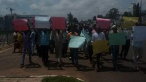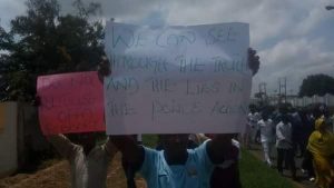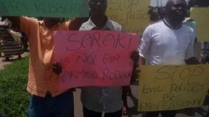 Some youths staged a protest today in Ilorin over the indictment of Saraki by police in Offa robbery.They were pictured with placards with various inscriptions like ‘Saraki is not an armed robber’ and more