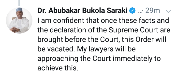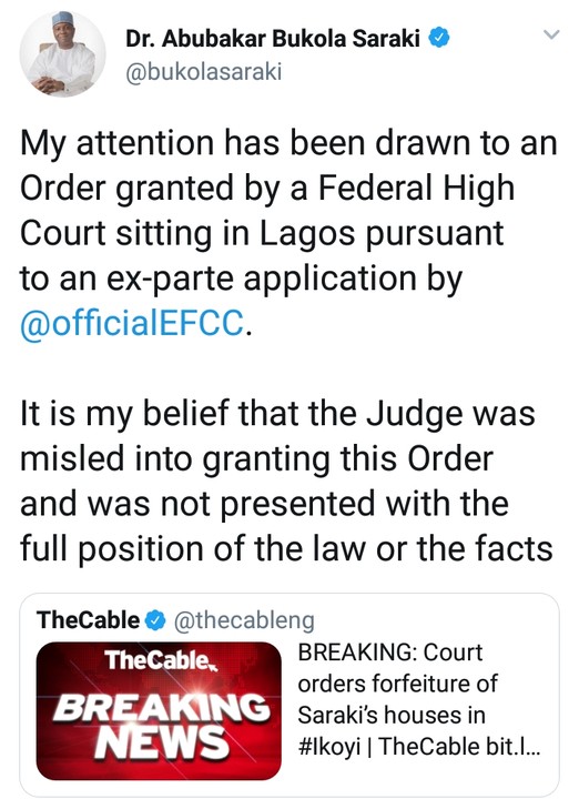 Bukola Saraki took to his twitter page to react after Court Ordered Him To Forfeit His Properties In Ikoyi.