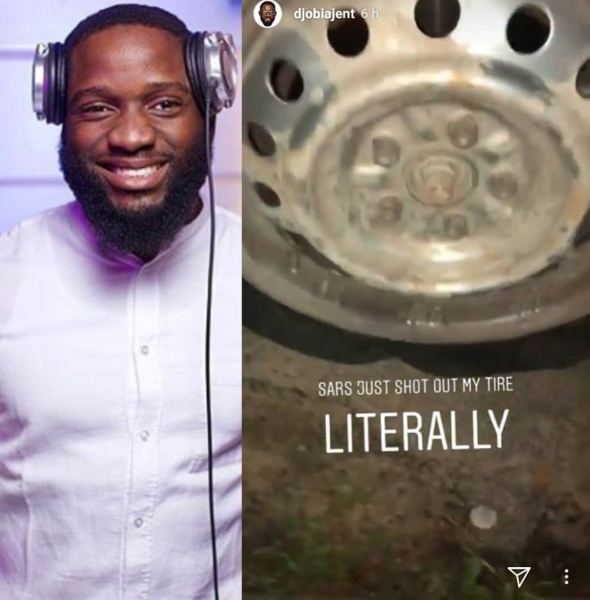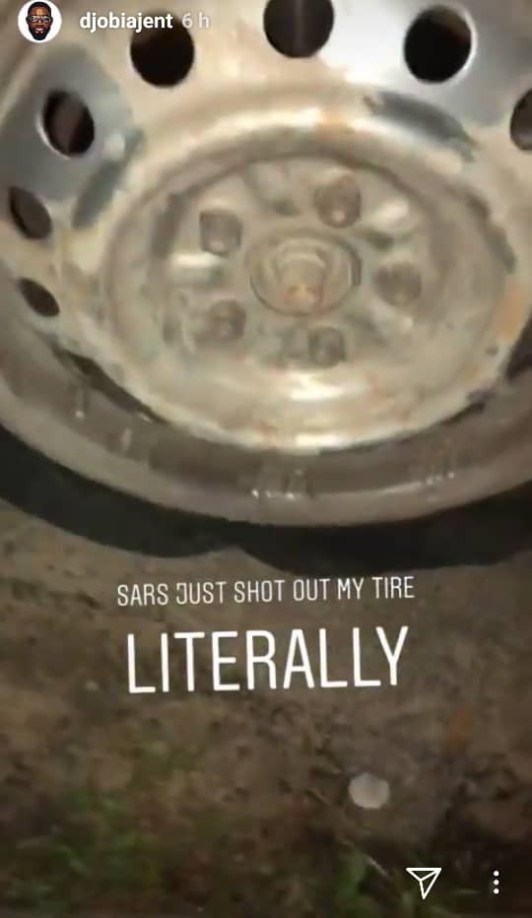 SARS officers shot at popular DJ Obi’s tyre last night. He shared a video of his punctured tyre on his Instatories. Accoridng to him, the SARS officers are from Makoko police station.