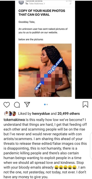 Sharing the fake photos with the threat message she received, Toke Makinwa wrote: