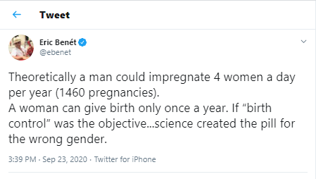 The 49-year-old took to Twitter to give an analogy by explaining that a man can impregnate four women a day per year which is equivalent to 1460 pregnancies, while a woman can give birth only once a year.