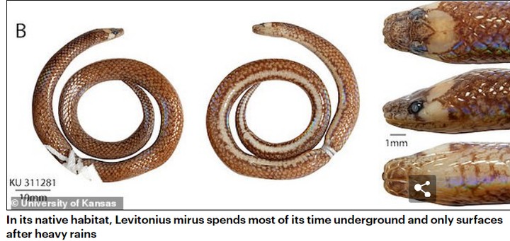 Levitonius mirus, also known as the Waray dwarf burrowing snake, is native to the Philippines.