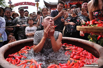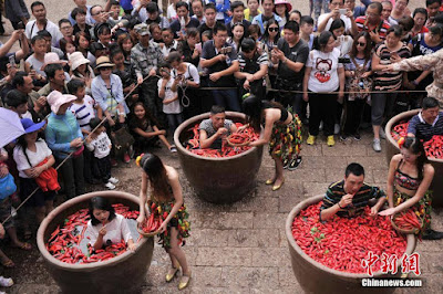 What a fun challenge! Some fun-seekers partook in a pepper-eating contest that was held in Lijiang, a tourist hotspot in southwest China’s Yunnan Province. They were apparently not afraid to engage in the fierce contest. According to reports, the competitors had two minutes to eat as many chillies as they could while sitting in giant urns filled with peppers.