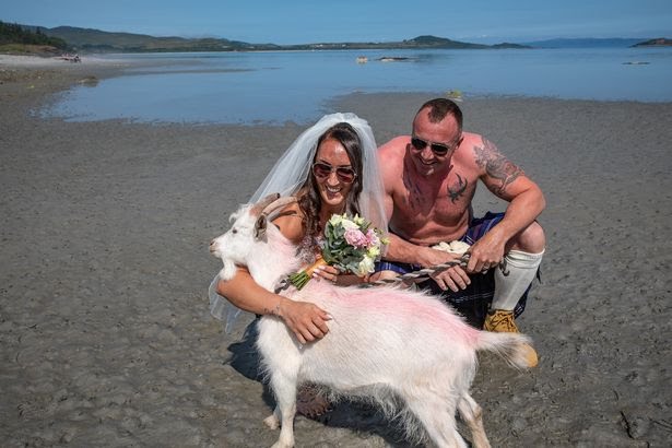 A loved up Scots couple who tied the knot on a remote beach became the talk of the island after having a random pet goat as their only guest.