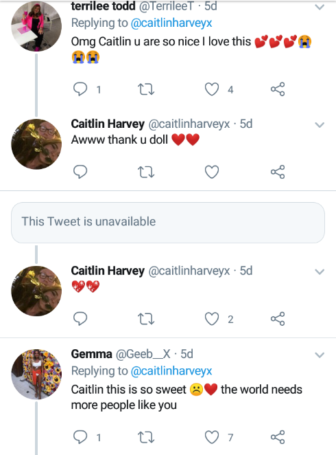 Another wrote: “Caitlin this is so sweet ☹️❤️ the world needs more people like you”