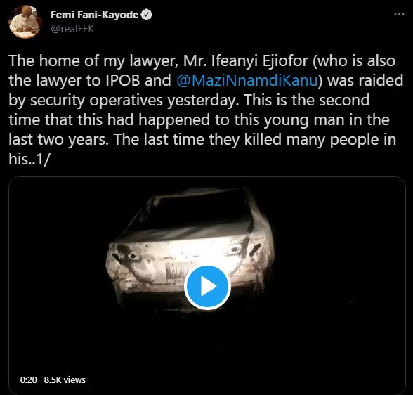 He wrote; “The home of my lawyer, Mr. Ifeanyi Ejiofor (who is also the lawyer to IPOB and @MaziNnamdiKanu) was raided by security operatives yesterday. This is the second time that this had happened to this young man in the last two years.”