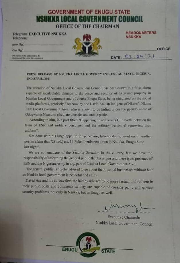 “We have the responsibility of informing the general public that there was and there is no presence of ESN anywhere in Nsukka Local Government Area and there is no incident involving Nigeria Army, or Fulani herdsmen in any part of the council area.