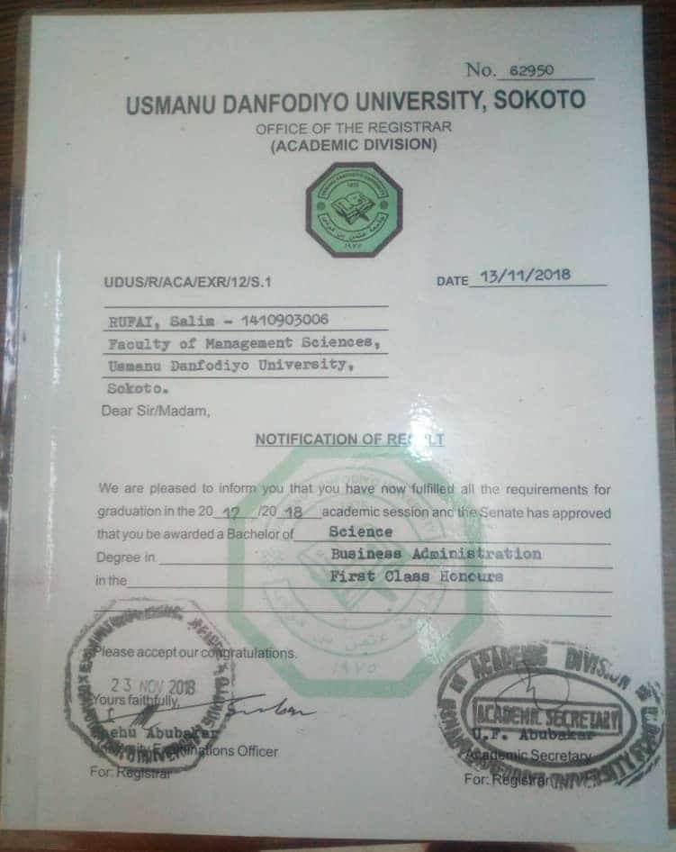 History has been made in the department of Business Administration, Usmanu Danfodiyo University Sokoto. Saleem Rufai became the first person to graduate with a first class degree in the history of the department since inception in 1975.