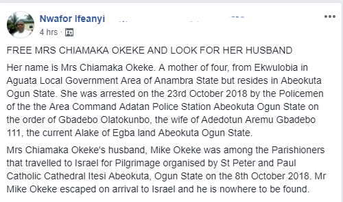Mrs Chiamaka Okeke’s husband, Mike Okeke was among the Parishioners that travelled to Israel for Pilgrimage organised by St Peter and Paul Catholic Cathedral Itesi Abeokuta, Ogun State on the 8th October 2018. Mr Mike Okeke escaped on arrival to Israel and he is nowhere to be found.