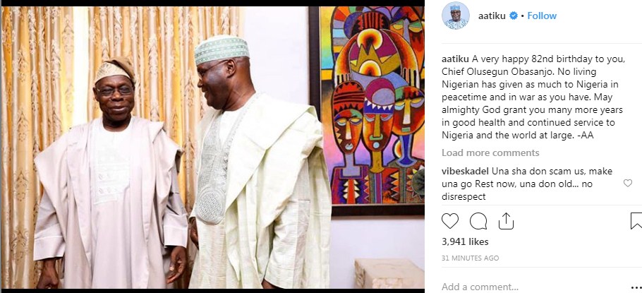 Former Vice President and presidential candidate of Peoples Democratic Party, PDP, Atiku Abubakar on Tuesday congratulated former President Olusegun Obasanjo as he turns 82 years old today.